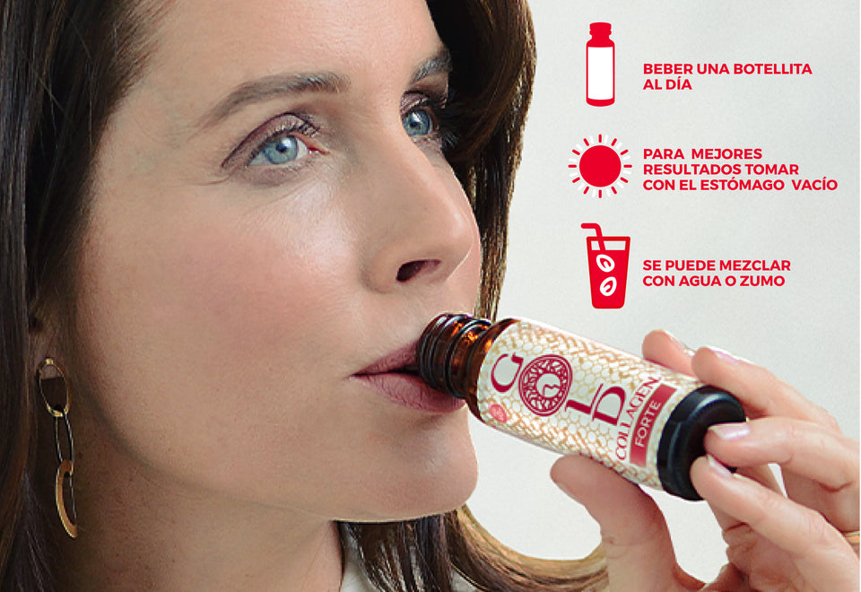 Para obtener resultados óptimos la dosis diaria recomendada: beber 1 botella (50 ml) todos los días con el estómago vacío para una mejor absorción o durante las comidas si tiene un estómago sensible o con malestar. Bebe 1 frasco al dia durante 3 semanas para estimular la hidratación de la piel, 6 semanas para la suavidad de la piel, 9 semanas para la firmeza de la piel. FORTE es genial cuando necesitas un impulso de energía gracias a sus 5g de proteínas y también porque contiene el 100% de tus necesidades diarias de Vitamina B6, C Y D. Se recomienda una ingesta regular. Agitar bien antes de usar y no exceder la dosis diaria recomendada.